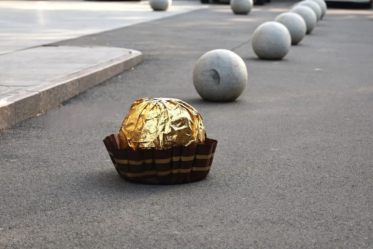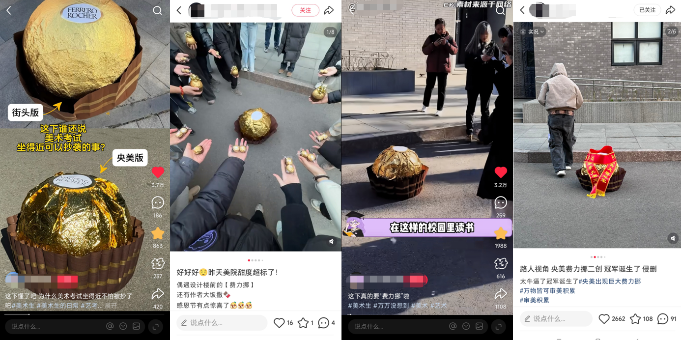 就是這個(gè)乍一看是平平無奇的石墩子,在這位同學(xué)的腦洞下,搖身一變成為巨型"費(fèi)列羅"巧克力!,又因其物理屬性被網(wǎng)友戲稱為"費(fèi)力挪",一夜之間刷爆了各大社交平臺,成了無數(shù)人專程前往央美打卡的新"萌物"。