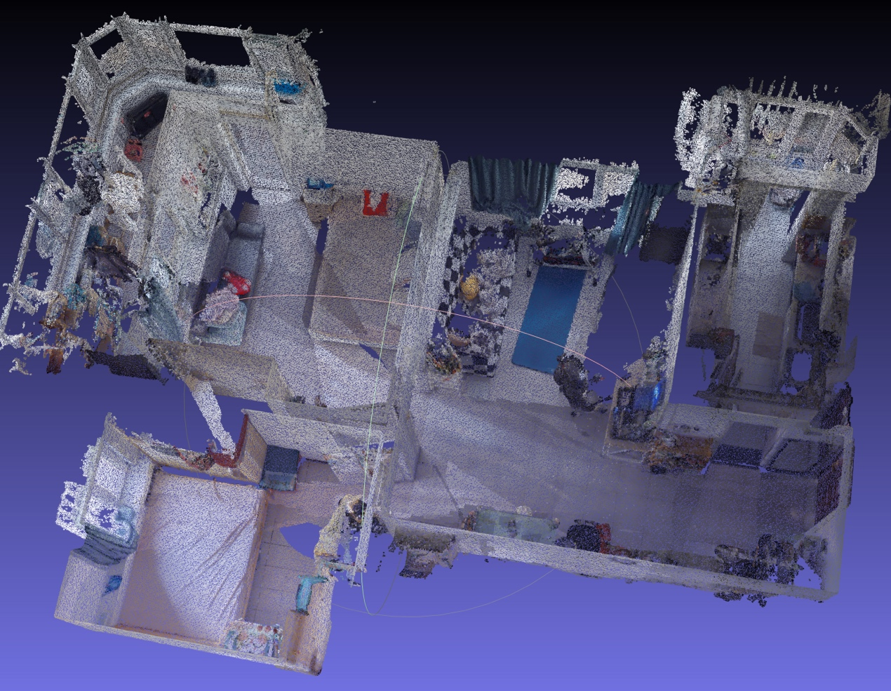 三維點(diǎn)云(Point Cloud)是三維空間中離散點(diǎn)的集合,其中每一個(gè)點(diǎn)至少需要包含一組三維坐標(biāo)(X, Y, Z),用于精確描述這個(gè)點(diǎn)在特定坐標(biāo)系下的具體位置。當(dāng)然,除了位置信息以外,每個(gè)點(diǎn)還可以附加有顏色、法線向量、強(qiáng)度值等其他更多的信息?;诙嗄暝谌S空間技術(shù)上的研發(fā),眾趣科技已經(jīng)能夠通過(guò)激光雷達(dá)、結(jié)構(gòu)光深度相機(jī),全景圖像預(yù)測(cè)等多種技術(shù)手段,獲得在某個(gè)點(diǎn)位環(huán)繞的三維點(diǎn)云數(shù)據(jù)。