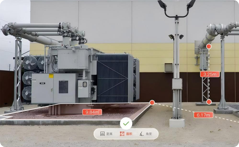 無需現(xiàn)場人工測量,即可在模型中對任意兩點(diǎn)距離、設(shè)備占地面積、導(dǎo)線安全距離等進(jìn)行高精度量算。